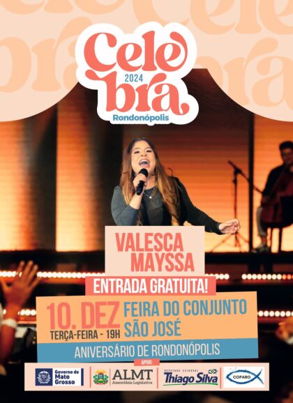 Rondonópolis comemora o seu aniversário com a segunda edição do "Celebra Rondonópolis", no dia 10 de dezembro, às 19h, na feira do Conjunto São José, com a participação especial da cantora gospel Valesca Mayssa. O evento vai proporcionar uma noite de adoração e louvor para toda a comunidade, sendo uma proposta idealizada pelo deputado estadual Thiago Silva (MDB), com o apoio do Conselho de Pastores, da Assembleia Legislativa e da Secretaria de Estado da Cultura de Mato Grosso (Secel).